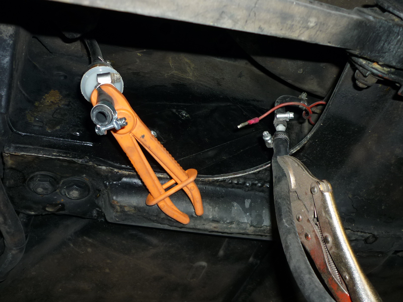 Der Benzinschlauch geht vom Tank in die Benzinleitung, die durch den Ramentunnel geht.