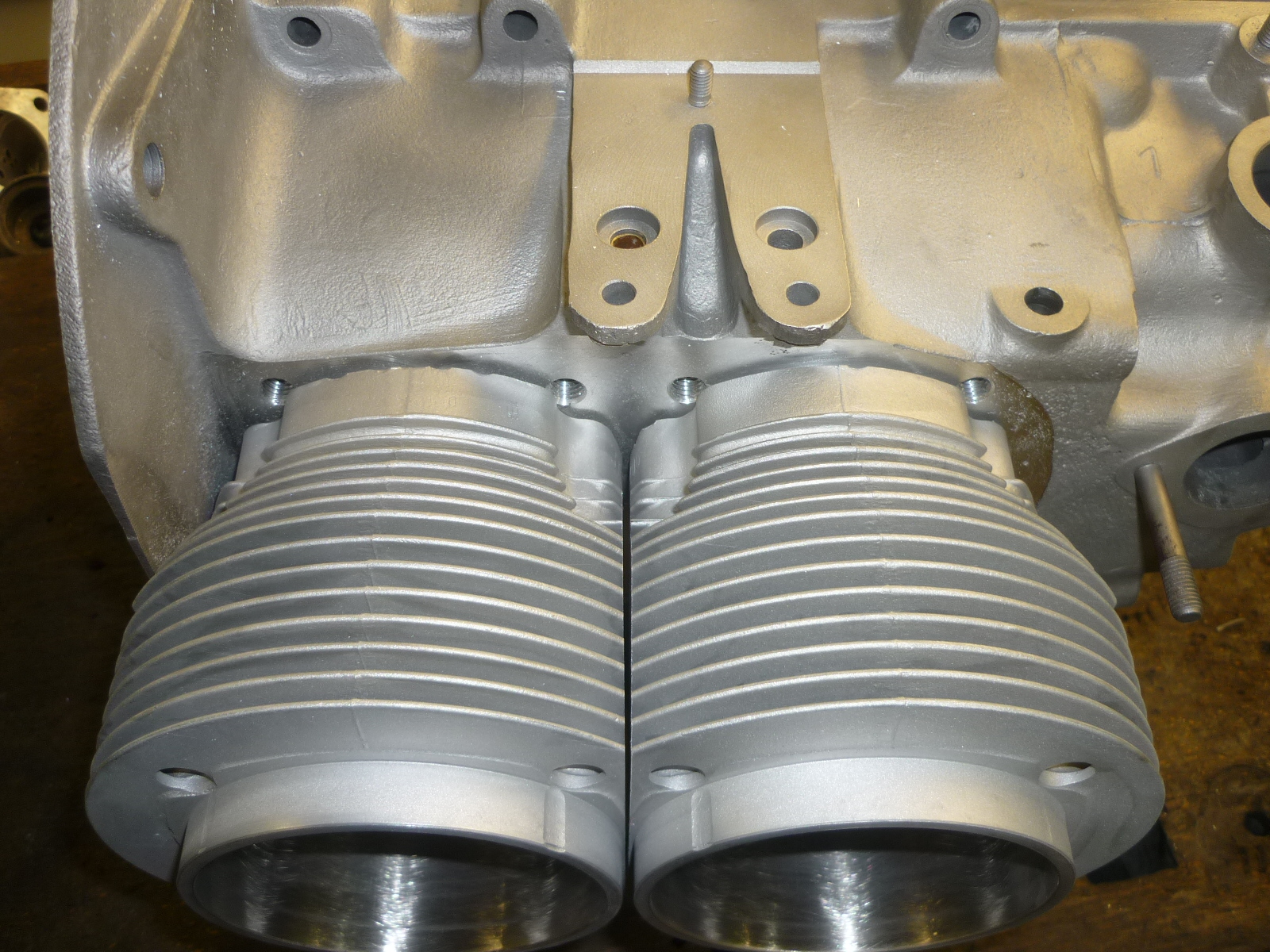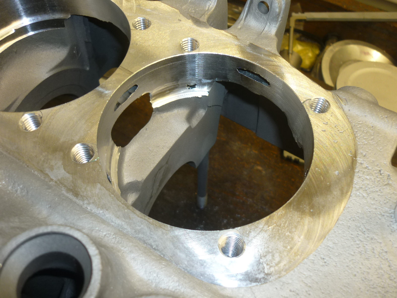 Mittels einer Bohrlehre wurden die neuen weiter aussen liegenden Gewinde für die Stehbolzen gesetzt. Jetzt Porschelochbild zur Aufnahme der Porsche-Zylinderköpfe.