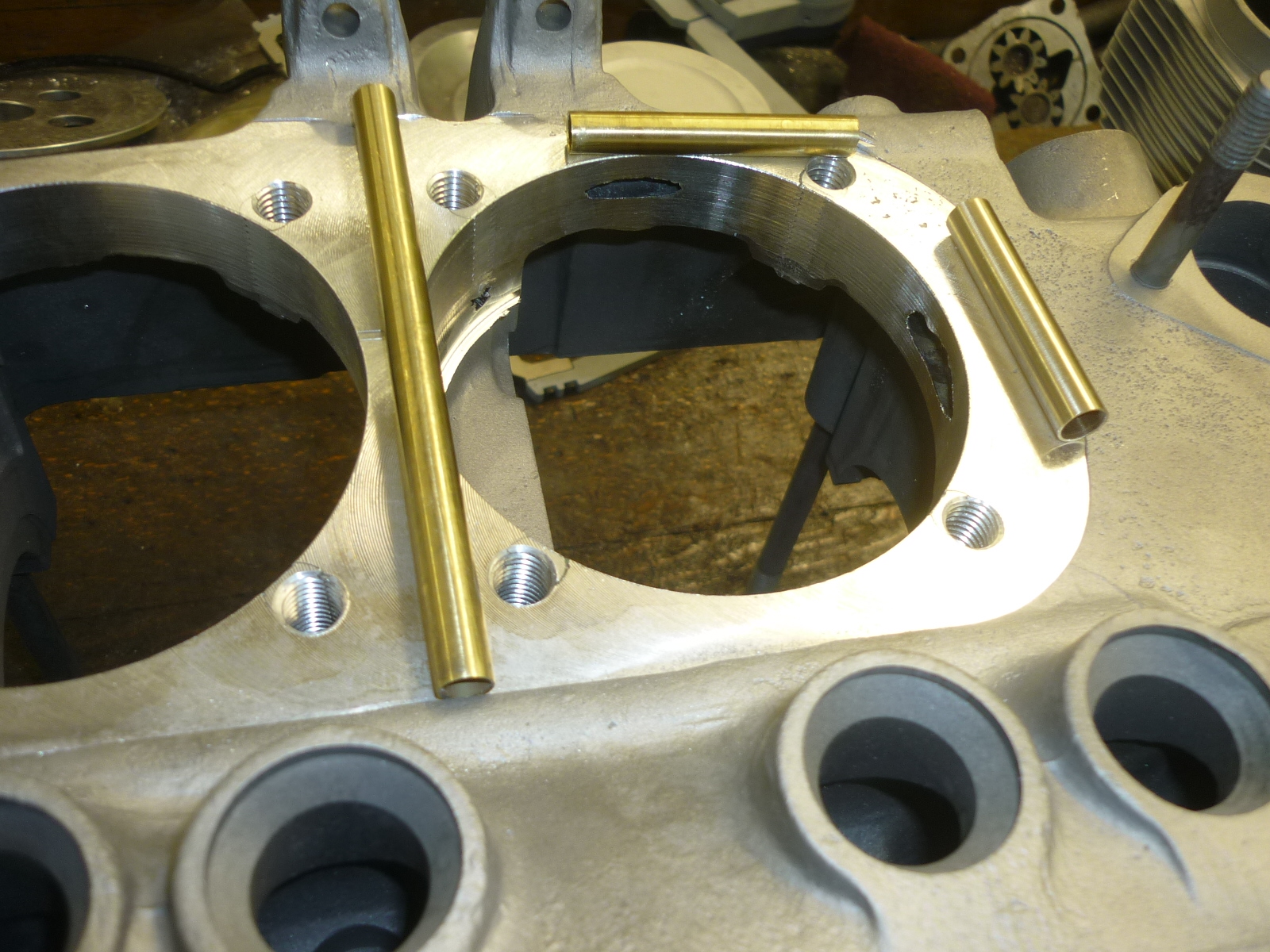 Im Bereich der Zylinderbohrung wurden die Messingröhrchen leicht eingedrückt und so an die 94mm Bohrung angepasst. Der Ölkreislauf ist wieder hergestellt.