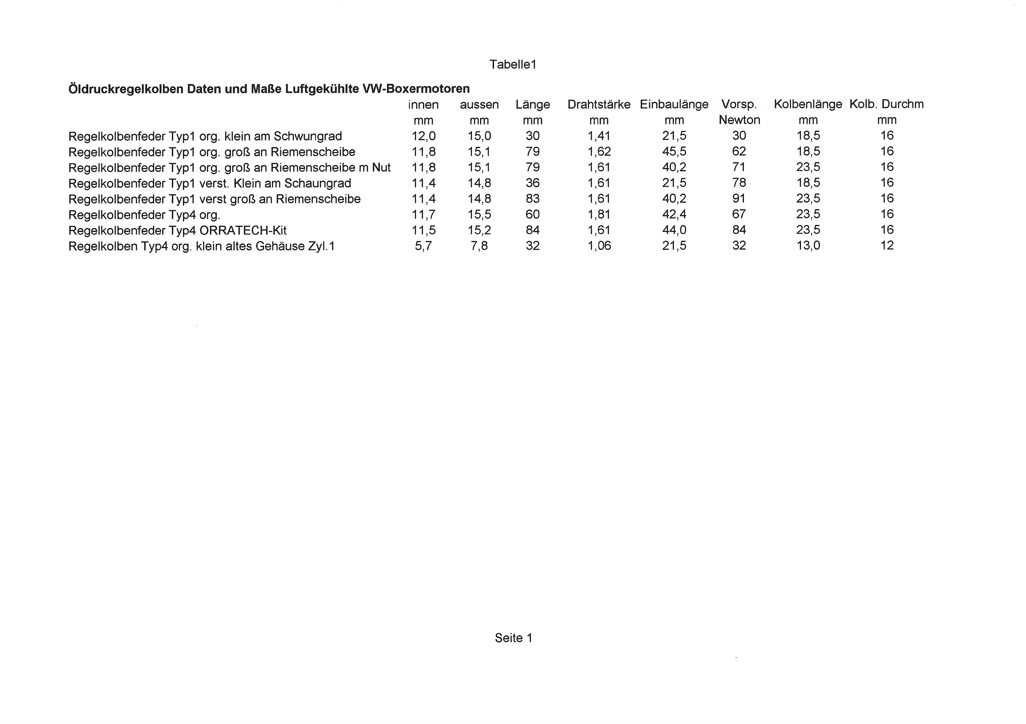 Technische Daten Öldruckregelkolben und Regelkolbenfedern.