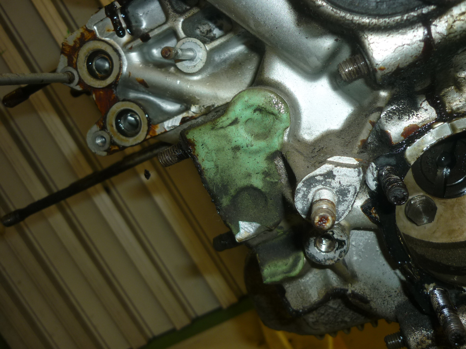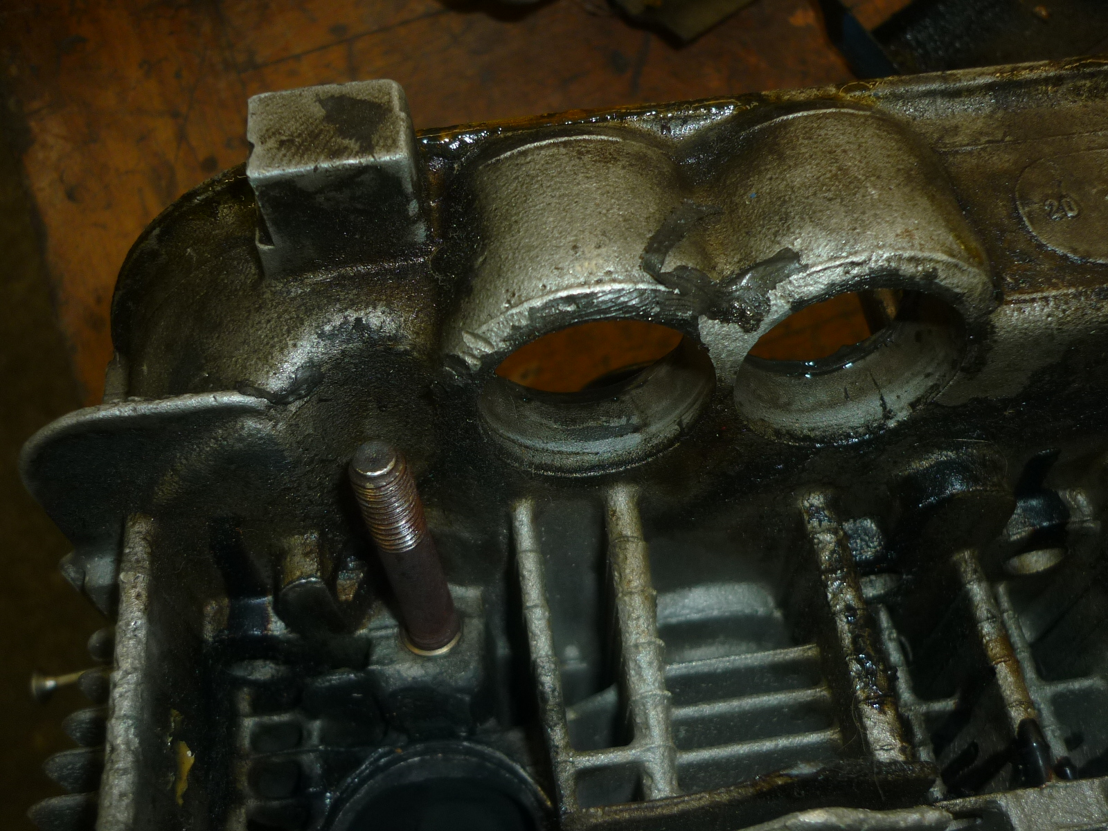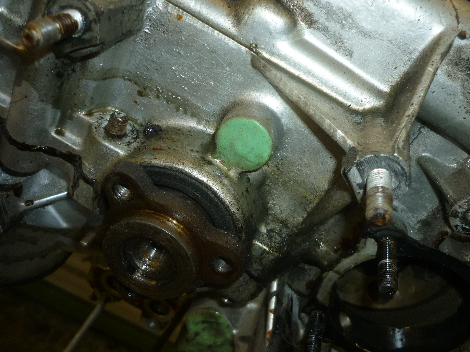 Die Reparateure haben Angst, der revidierte Motor könnte wieder öllecken. Also kleistern sie an allen Ölstopfen Epoxy von aussen drauf.