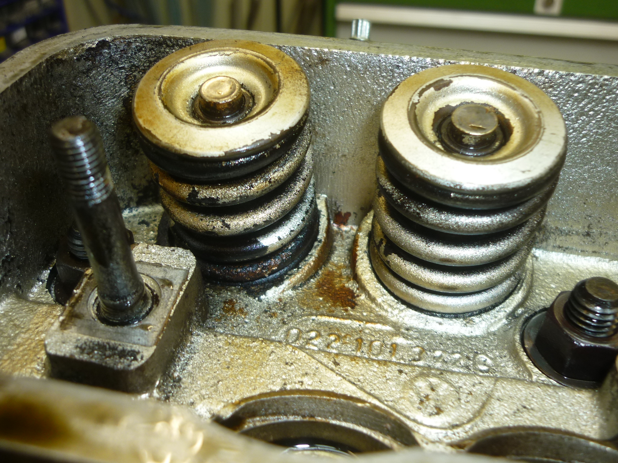 Ein Ventilsitz ist in den Kopf eingehämmert. Gut, der Mechaniker war innovativ. Er hat verschiedene Befestigungsschrauben für die Zylinderunterbleche verwendet, welche wiederum ihrerseits eine weitere neue Farbkombination bieten. Steingrau war hier wohl im Angebot. Ach ja, hatte ich schon erwähnt, dass die beiden Zylinderköpfe unterschiedliche Ventilgrößen haben?